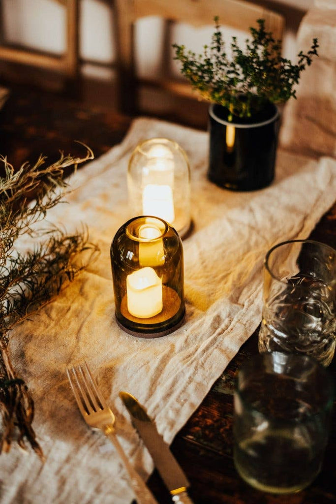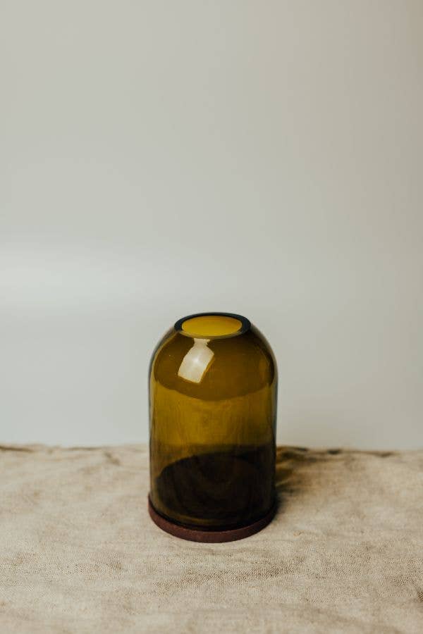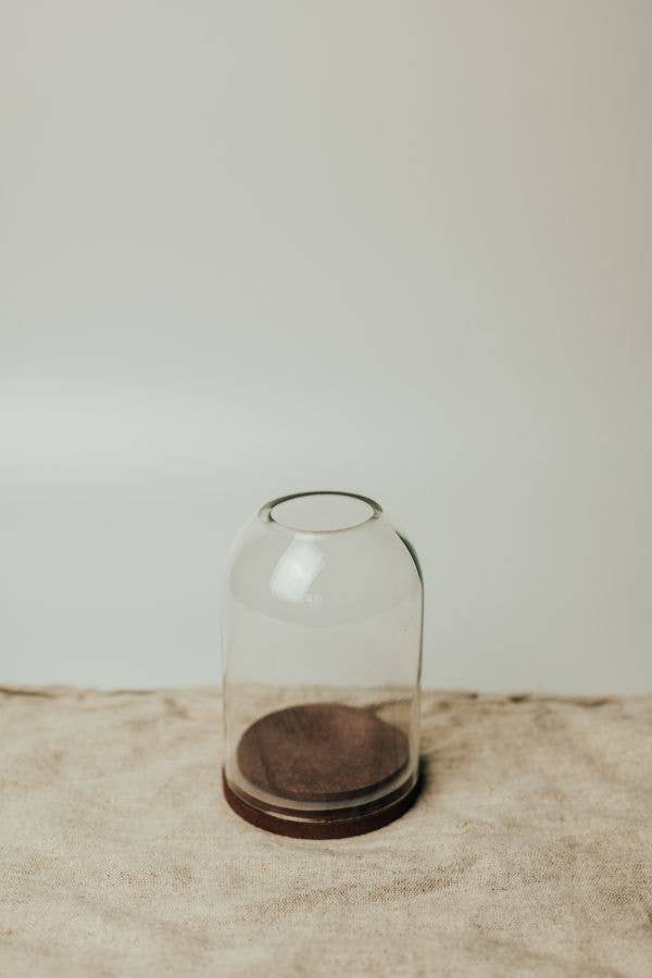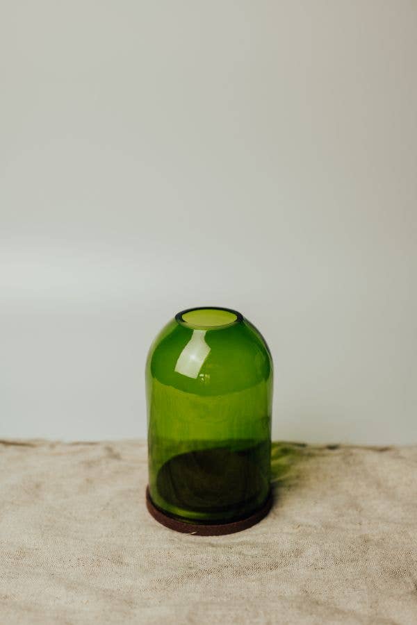 Enhance your space with our elegant, handcrafted candle holder, perfect for creating a cozy atmosphere in any room or garden. Featuring a repurposed glass dome to protect the flame and a sturdy, removable wooden base for easy access, this versatile piece offers both style and functionality. Available in clear or green glass and compatible with our unique glass cups and tea lights, it also supports hanging arrangements with our eco-friendly cotton cord hangers. Elevate your decor and illuminate your evenings with this beautiful and safe addition.